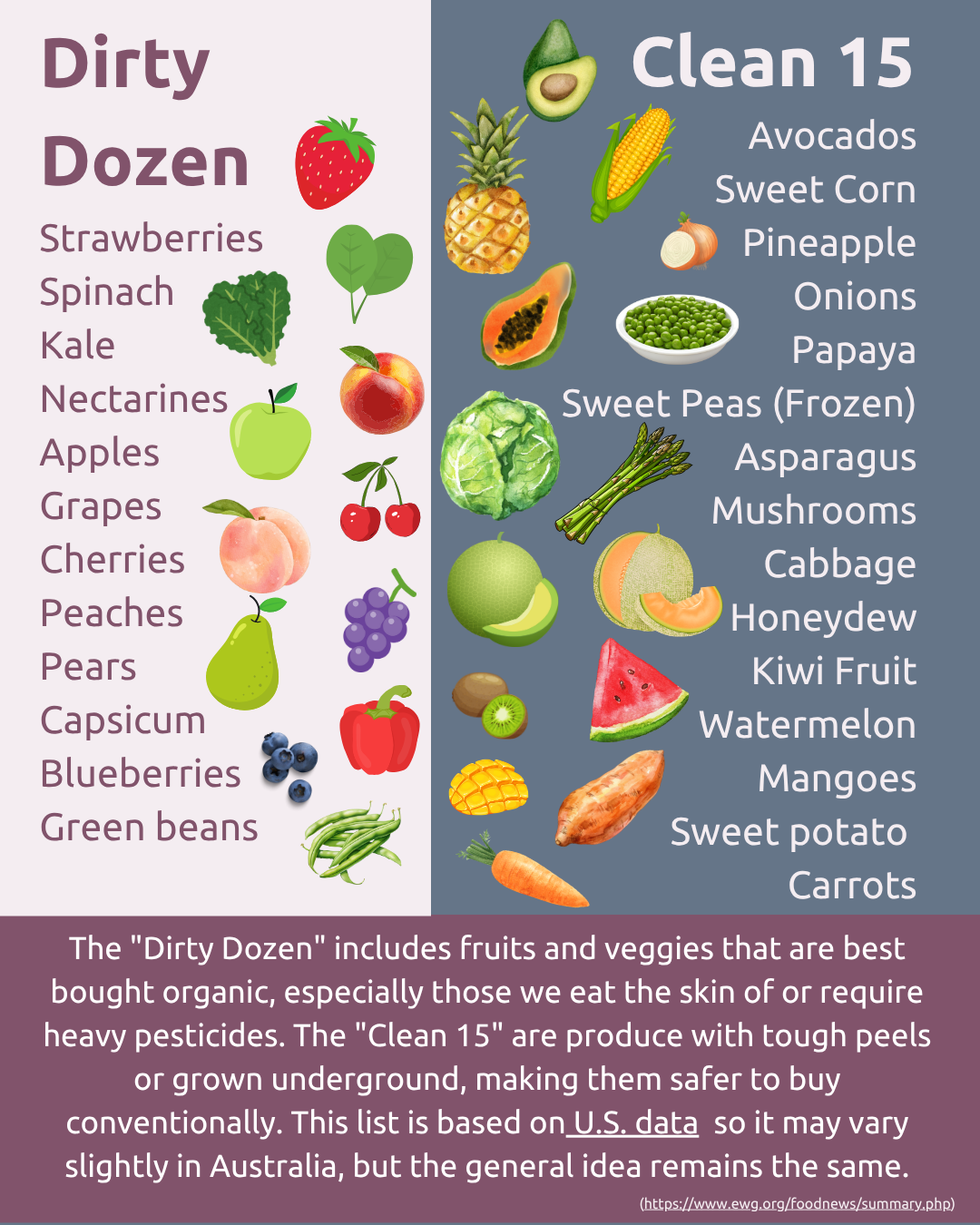 I try to buy organic or local where I can, but I’m also realistic. When shopping at the supermarket, I use the “Dirty Dozen and Clean 15” guide to help prioritise which foods are worth buying organic. (I’ve included a reference pic below if you're not familiar with it!) When I can, I’ll order an organic fruit and veg box or visit the farmers’ markets.